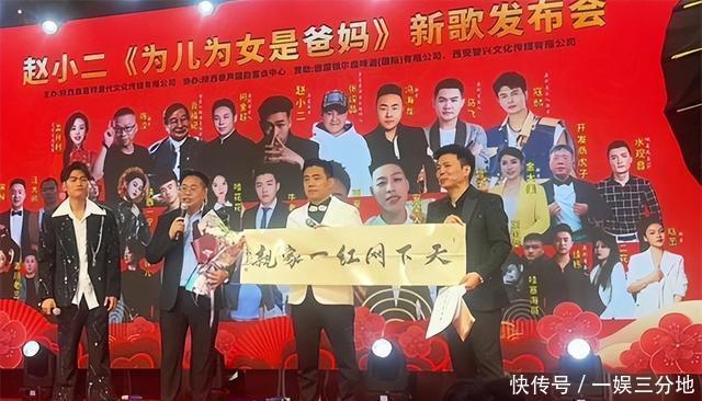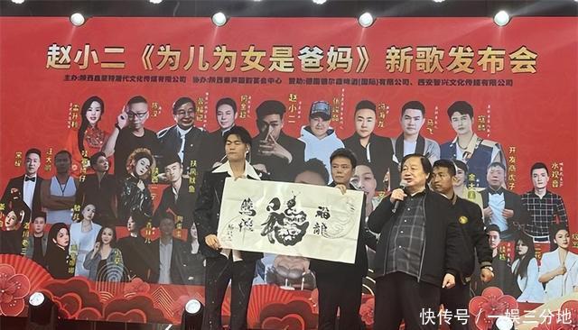 张龙(著名文化学者、香港中文大学客座教授、陕西文旅推广大使、西部新闻网总编辑):身兼多重身份的他,自带能量气场。他看到满场为亲情、音乐而来的朋友,特别感动!”张龙一开口便拉近与现场距离,随即点赞赵小二:“你从影视到音乐都扎实,《粮心》《尽孝要趁早》暖了百姓心,今天这首新歌更是把‘孝’唱进了大家心坎里!”他不仅送上《赵小二新歌发布》《天下网红一家亲》两幅书法,更即兴用《苹果香》旋律改编歌词,歌声灵动悠扬,瞬间点燃全场大合唱,成为发布会火“出圈”的场面之一。 二、创作核心:何金超的“才子魅力”